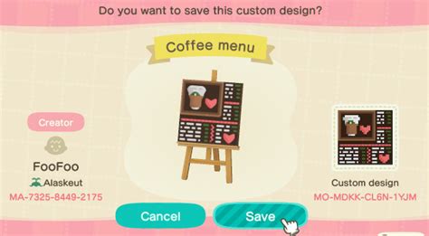Acnh Cafe Design Code. Next craft some ironwood cupboards to display all the desserts you can sell at your tea shop. Check out the list of acnh cute path codes, which also can be used for ground, floor, and tiles, as well as the acnh cute outfit codes for your dresses, shirt, overcoat, cap, and clothing.